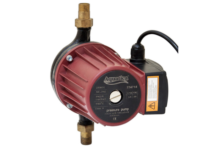 Насос для повышения давления 270Вт Hmax 12м Qmax 47л/мин Ø¾" 195мм + гайки Ø½" AQUATICA (774714) предназначен для перекачивания чистой воды и повышения давления в существующей системе водоснабжения. Может использоваться для создания напора перед бойлерами, колонками, стиральными и посудомоечными машинами. Корпус: чугун; вал двигателя: керамика; рабочее колесо: технополимер. Тип двигателя: асинхронный, бесшумный; обмотки статора: медь; гильза статора электродвигателя: нержавеющая сталь AISI 304; подшипник: керамический радиальный; напряжение: 220-240 В; частота: 50 Гц; класс изоляции: Н; класс защиты: IP42; длина кабеля: 1 м; датчик протока для автоматического включения/выключения при расходе в точке водоразбора. Патрубок: DN1: ¾"; резьба переходников: ½". Температура перекачиваемой жидкости: +60 ºC; температура окружающей среды до +40 ºC; давление в системе: до 6 бар; только для чистой воды без абразивосодержащих примесей (песка, глины, извести и т.д.); (pH): 6.5 - 8.5; гарантия 1 год.