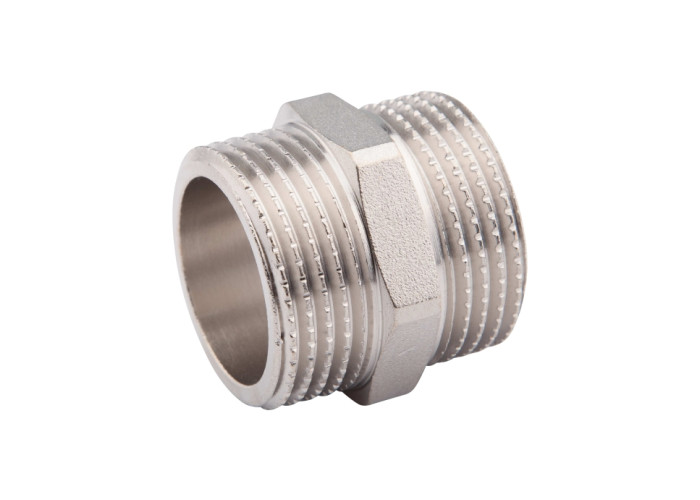 Ниппель усиленный SD Forte подключение 1" НН изготовлен из никелированной латуни, предназначен для соединения труб одинакового диаметра.