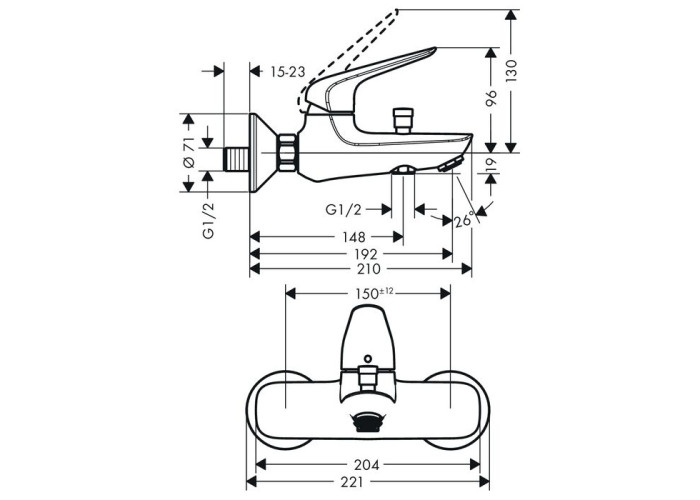 Смеситель для ванны, настенный, однорычажный, ВМ, хром. Материал - латунь. Картридж: керамический. Подвод: G ½". Длина излива: 192 мм. Регулятор струи: аэратор.