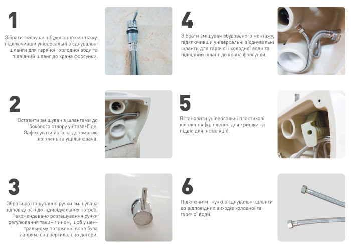 Не требует дополнительного подвода воды – подключение производится непосредственно через форсунку в чаше унитаза. Длина шлангов подвода воды - 40 см.