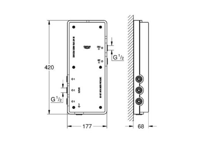 Термостат электронный, встраиваемый, скрытый монтаж, для использования с электронными комплектами для ванны и душа; 1/2"-подключения (подача горячей/холодной воды), 3 трубкообразных отвода 1/2", электропитание 230V AC/ 6 V DC включая кабели, DR-латунь, встроенный термоэлемент, технология совершенного потока при уменьшенном расходе воды