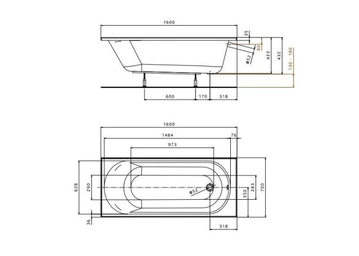 OPAL PLUS ванна 160*70см прямоугольная, без ножек