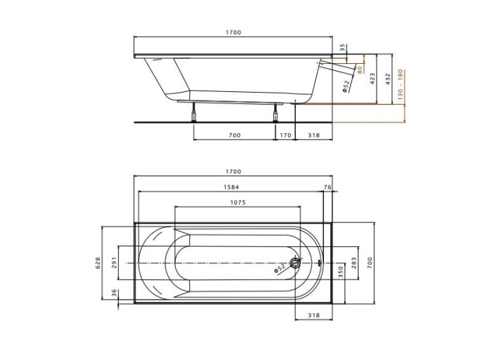 OPAL PLUS ванна 170*70см прямоугольная, без ножек