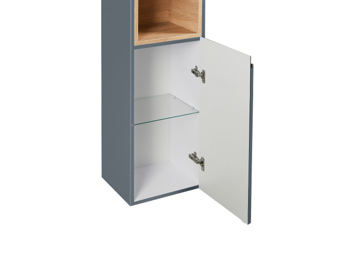 Пенал підвісний Qtap Robin N Graphite/Whitish oak QT1376PP16520RGWO виконаний в сірому кольорі, корпус виготовлений з ЛДСП, фасадна частина з МДФ з глянцевим покриттям. Виріб оснащений двома відділеннями з одностулковими дверима, всередині розташовані скляні полиці. Стильна поличка кольору білого дуба є яскравим акцентом у виробі. Пенал виконаний в елегантному лаконічному стилі, який впишеться в дизайн будь-якої ванної кімнати. Плавний хід закриття дверцят забезпечує доводчик.