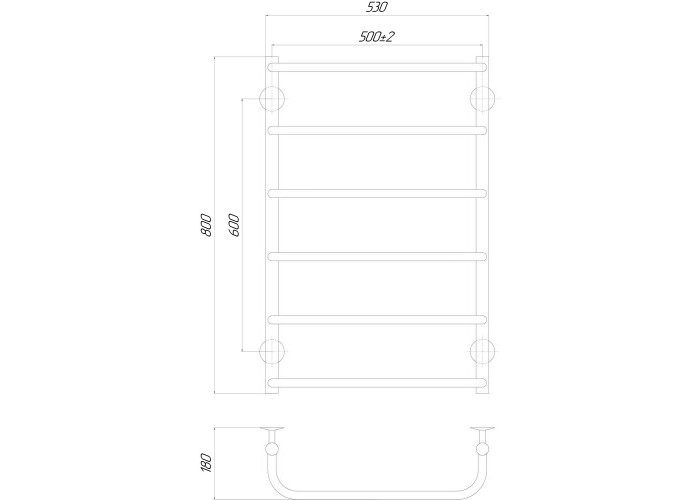 Полотенцесушитель, комплект креплений (дюбель-гвоздь - 4 шт.; втулка крепежная - 4 шт.; гайка круглая - 4 шт.; винт установочный - 4 шт.; блюдце декоративное - 4 шт.; ключ шестигранный L2 - 1 шт.), вилка.