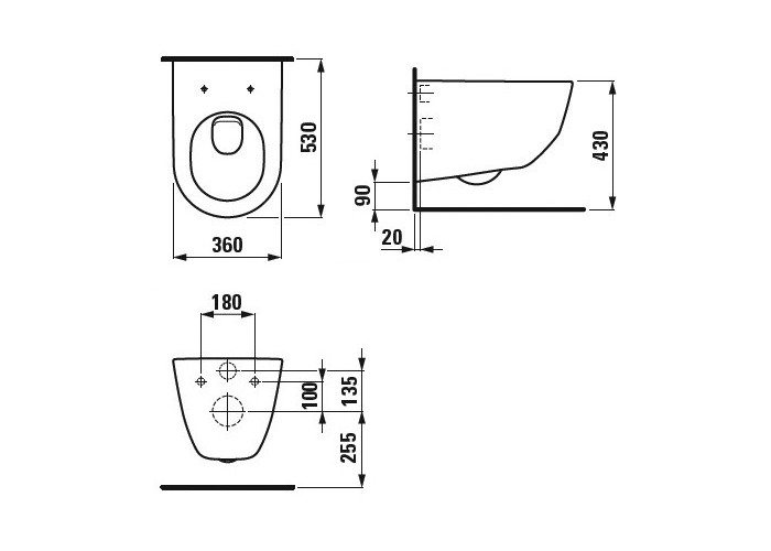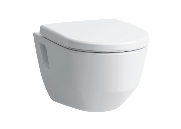 Чаша подвесного унитаза, округлой формы, материал - санфаянс, без ободка, вертикальное подключение к канализации. 530*340*365 мм.