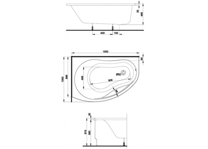 Ванна акриловая ассиметричная Коло-Дымер, с ножками. Длина 1500, ширина 1000 мм, глубина 465 мм, объём 220 л. Для пристенного монтажа