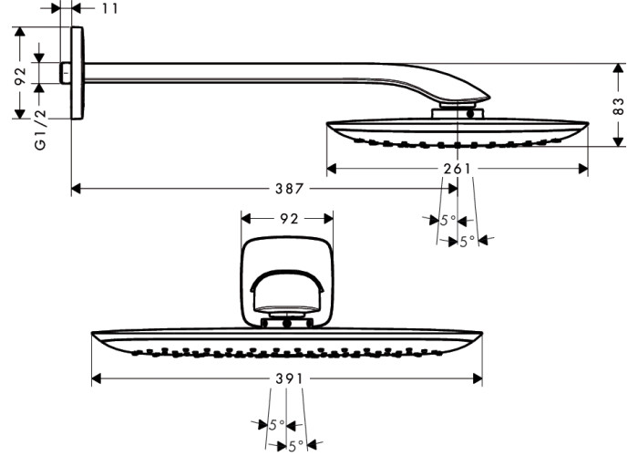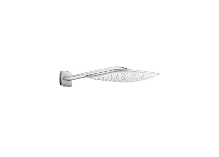 PuraVida Верхний душ Размер душевого диска: 390x260 mm, тип струи: RainAir (дождевая струя с подмешиванием воздуха), расход воды при режиме RainAir: 21 л/мин.,  поверхность душевого диска в двух вариантах: хром или белая, длина  держателя для душа: 390 mm, материал душевого диска - металл, монтаж: стена