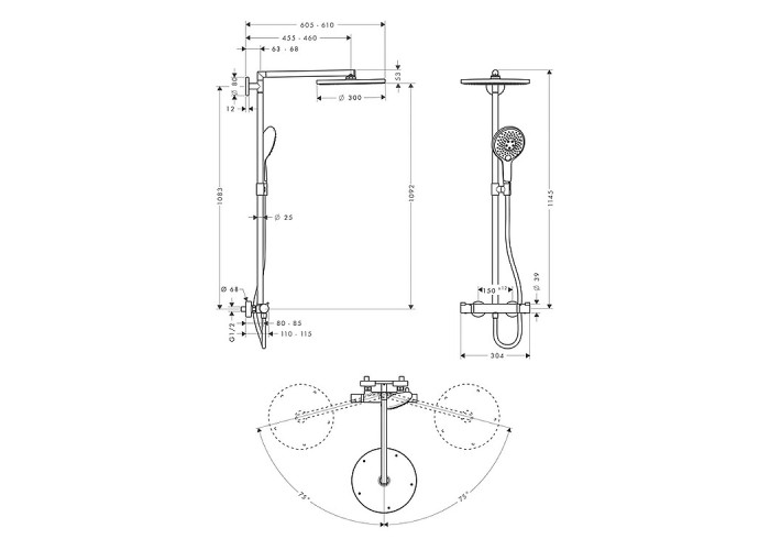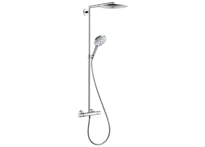 Raindance Select S 300 Showerpipe Душевая система с Термостатом Размер душевого диска: 300 mm, тип струи: RainAir (дождевая струя с подмешиванием воздуха), расход воды при режиме RainAir: 17 л/мин., поверхность душевого диска: хром, длина  держателя для душа: 460 mm, поворотный держатель для душа, термостат Ecostat Comfort, предохранительный стопор при 40°C, настройка ограничения температуры горячей воды, управление путем поворота, вид монтажа: внешний, держатель для ручного душа с регулируемой высотой