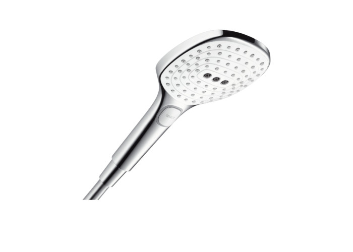 Raindance Select Ручной душ Размер душевого диска: 120 mm, тип струи: Rain, RainAir (дождевая струя с подмешиванием воздуха), массаж, расход воды: 16 л/мин, комфортное переключение типа струи кнопкой выбора, подходит для работы с проточным водонагревателем