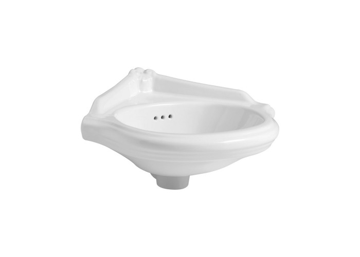 Раковину Azzurra Victorian style JUB35B1/AN зручно використовувати у маленькій ванній кімнаті. Вона монтується на стіну в кутку та не забере багато місця. Завдяки оптимальним габаритним розмірам виробу, бризки не будуть розлітатися. Перелив здійснюється через три отвори. На куті раковини передбачена поверхня, на якій можна розмістити склянку або засоби гігієни. Кут декорований перегородкою.