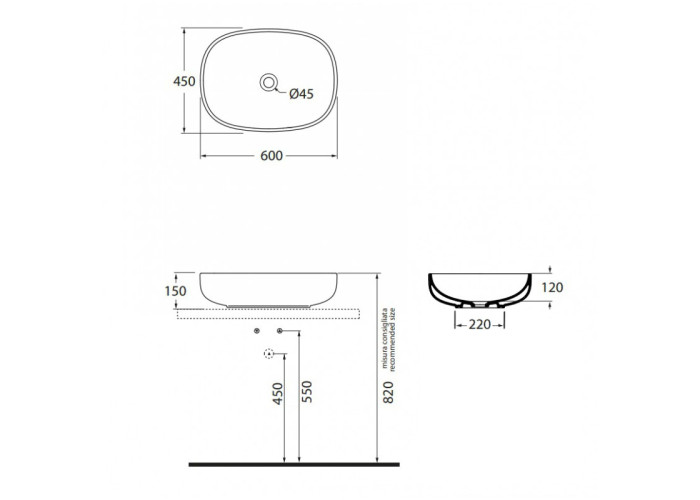 Раковин-чаша Azzurra Clas+ CLI60B1 становится все более популярным и востребованным вариантом в современных ванных. Она устанавливается на столешницу или тумбу, тем самым не занимает место внутри них, а все подводы скрыты. Раковина не оборудована отверстием под смеситель, но он будет более привлекательно смотрится на стене или рядом на столешнице. В последнем варианте рекомендуем обратить свое внимание на смеситель с высоким изливом. Диаметр сливного отверстия d=45 мм.