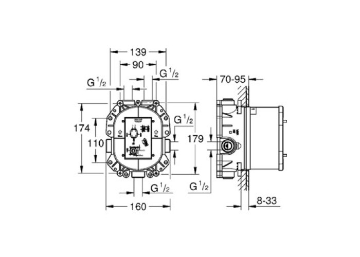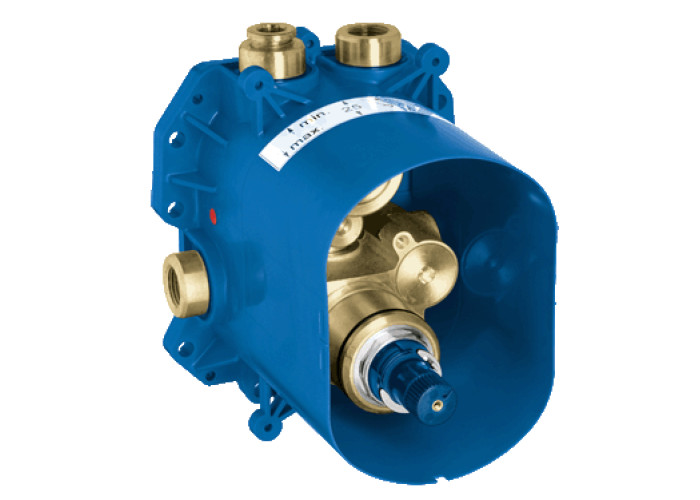 Встроенный универсальный термостат для ванной, душа и центрального термостата, без комплекта верхней монтажной части, неглубокая заделка 70-95 мм, элементарная встройка, полностью смонтирован и проверен на заводе; встроенный термоэлемент, большой расход воды 50 л/мин при использовании всех выводов, 2 вывода сверху по 1/2", отвод снизу 1/2" - только для использования с запорным вентилем, надежный монтаж благодаря прочному корпусу и защитной накладке, подготовленные точки крепления для сухого и мокрого монтажа, материал для уплотнения к стене в комплекте; аквадиммер или запорный вентиль в сборе, корпус из латуни с низким содержанием цинка, встроенные обратные клапаны и грязеулавливающие фильтры, технология совершенного потока при уменьшенном расходе воды, класс шума I по DIN 4109, минимальное давление 1,0 бар