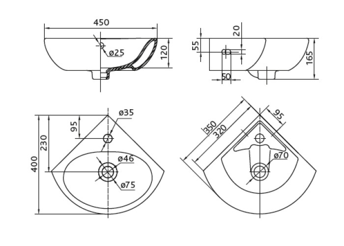 RUNA умывальник угловой с отверстием, с переливом 35*45 см (укр.)