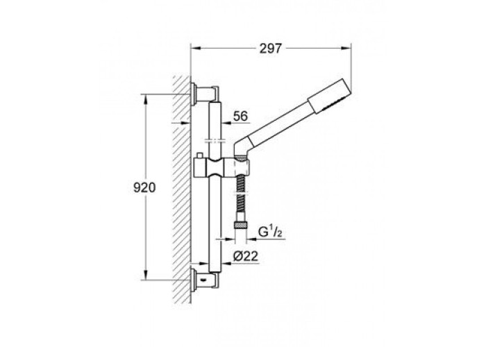 Душевой гарнитур со штангой, настенный. Включает в себя: ручной душ, душевая штанга 900 мм, угловой адаптер, душевой шланг Relexaflex 1750 мм 1/2 x 1/2, хромированная поверхность