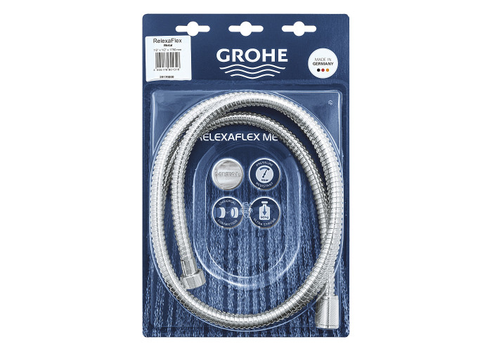 GROHE StarLight - хромоване покриття. GROHE UltraStrong - стійкість душового шланга до натягнення до 50 кг. GROHE Universal Connection - універсальність підключення шланга.