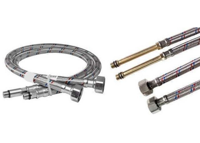Застосовуються для підключення як і холодного, так і гарячого водопостачання. Червоні і сині нитки, вплетені в оплетку, свідчать про можливість використання гнучкого шланга для гарячої та холодної води.