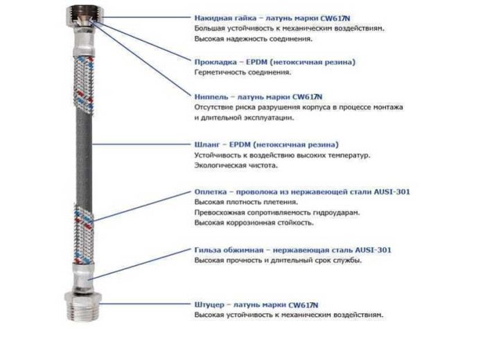 Внешняя оплетка обеспечивает изделиям высокую прочность и устойчивость к внешним механическим воздействиям, а также резким перепадам давления рабочей среды. В качестве материала оплетки шланга применяется проволока, изготовленная из нержавеющей стали марки AISI-301. Качественная оплетка из 7 нитей позволяет подводке выдерживать рабочее давление 10 атм. и более.