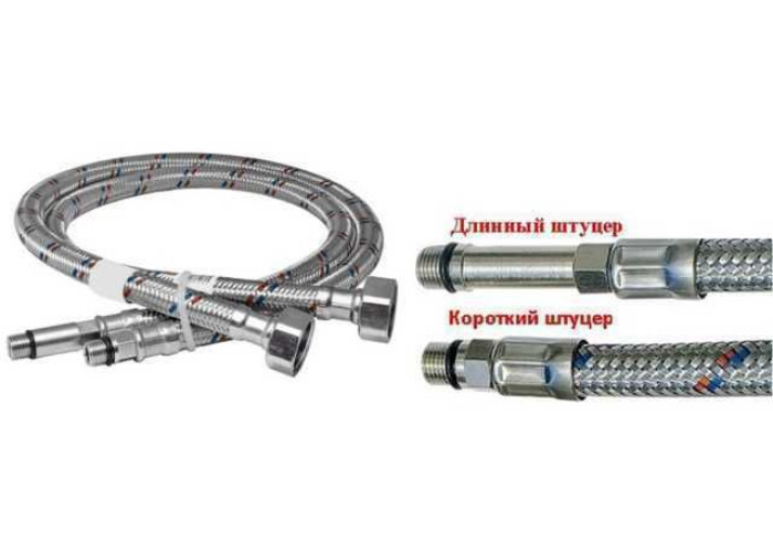 Применяются для подключения как и холодного, так и горячего водоснабжения. Красные и синие нити, вплетенные в оплетку, свидетельствуют о возможности использования гибкого шланга для горячей и холодной воды.