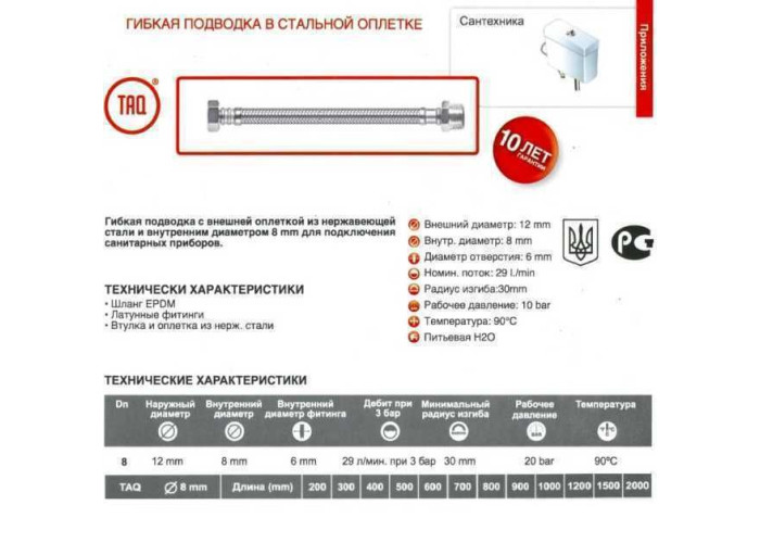 Шланг резиновый TUCAI (нержавейка) изготовлен из качественных и экологичных материалов, что позволяет подключать ее в водопроводные системы с питьевой водой. Также он не теряет своих качественных характеристик при использовании в технических системах, в системах горячего водоснабжения