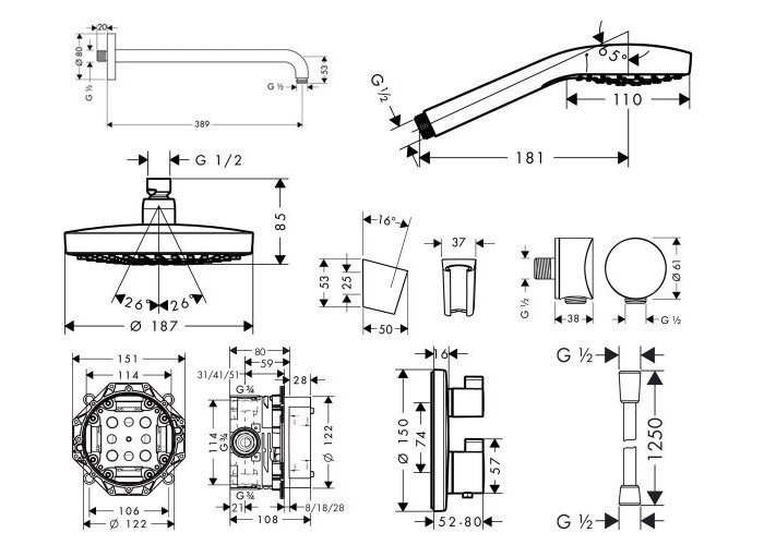 Душевой набор. Состоит из: верхнего душа, держателя душа 389 мм, ½’ ручного  душа, шланга  1,25 м, ½’ , держателя, шлангового подсоединения ½’ . Термостат с запорным/переключающим вентилем, iBox universal скрытая часть, ½’ / ¾’