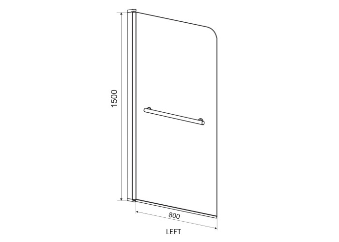 Штора на ванну 800*1500 мм, стекло прозрачное 6 мм, левая, вертикальная алюминиевая повортоная петля с подьемом. Штора комплектуется поручнем, который можно использовать в качесте полотенце-держателя.