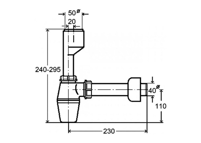 Сифон для писсуаров бутылочный, наружный без выпуска, диаметр 50*40 мм, длина 240 мм, пластик, горизонтальный выпуск