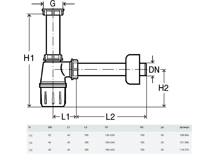 Полусифон для умывальника, пластик, без наличия перелива, комплектация : декоративная розетка Ø 50 мм