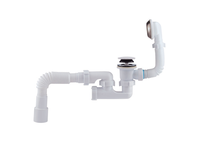 Сифон для ванни з переливом Krono Plast В0550К виконаний з пластику в класичному білому кольорі, має гладку внутрішню поверхню, що не тільки робить його поцінним, але й перешкоджає накопиченню бруду на стінках. Виріб не зазнає впливу корозії, не дає каналізації засмічуватися, а, у разі потреби його очистити, внизу коліна передбачено отвір-ревізію. Для закриття/відкриття зливного отвору досить натиснути на клапан один або два рази. Гофровані труби дають можливість змінювати їх довжину і кут.