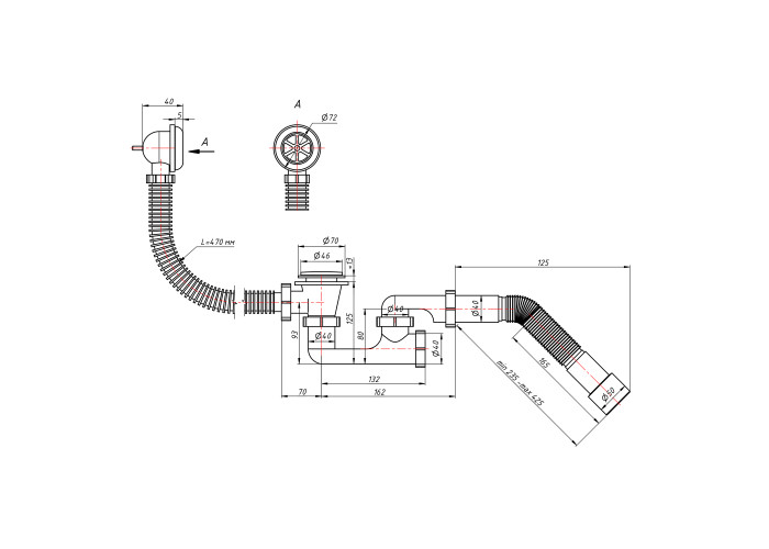 Довжина переливу: 470 мм. Довжина гофрованої труби 235-425 мм.