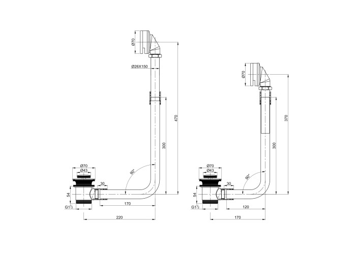 Сифон наружный металлический в комплекте с хромированным отводом и хромированным гидрозатвором. Высота и длина сифона регулируема, на схеме приведены минимально и максимально возможные установочные параметры. Материал всех составляющих сифона- латунь. Рекомендуем к ваннам VOLLE 12-22-706 и 12-22-314.