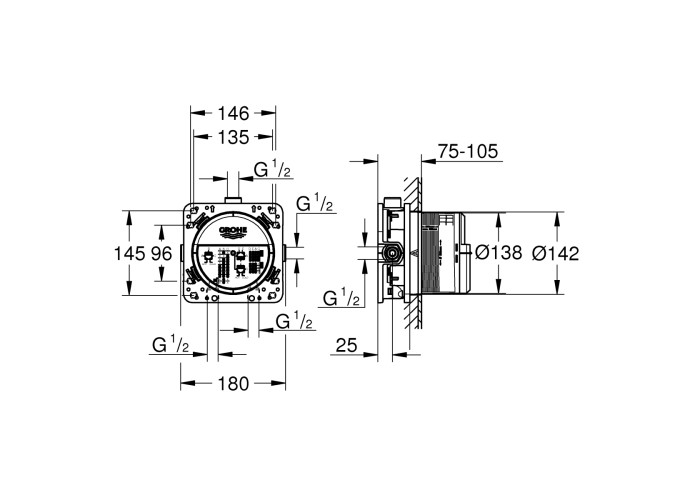 Монтаж настенный встраиваемый. Глубина монтажа 75-105 мм. Подводка воды 3 отвода воды 1/2 дюйма.