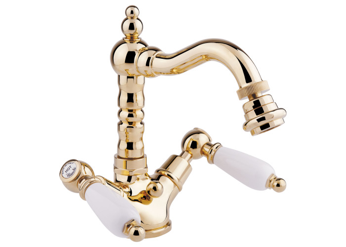 Змішувач для біде Bianchi First BIDFRS1037#026IAORO виконаний з білими вентильними ручками та глянцевою золотою поверхнею, яка виглядає багато та зробить інтер‘єр королівським. Підійде для ванни в стилі ретро, класика або чудово поєднається з ванними аксесуарами такої ж моделі, або такого ж кольору. Поверхня стійка до корозії та збереже свій блиск на довгі роки завдяки виготовленню з латуні, додаванню нікелю товщиною 11 мкм і порошкової фарби. Виріб монтується врізним способом на обідок біде.