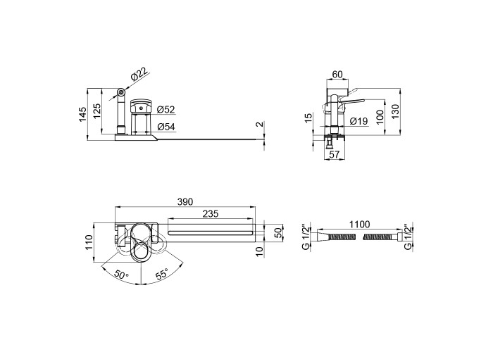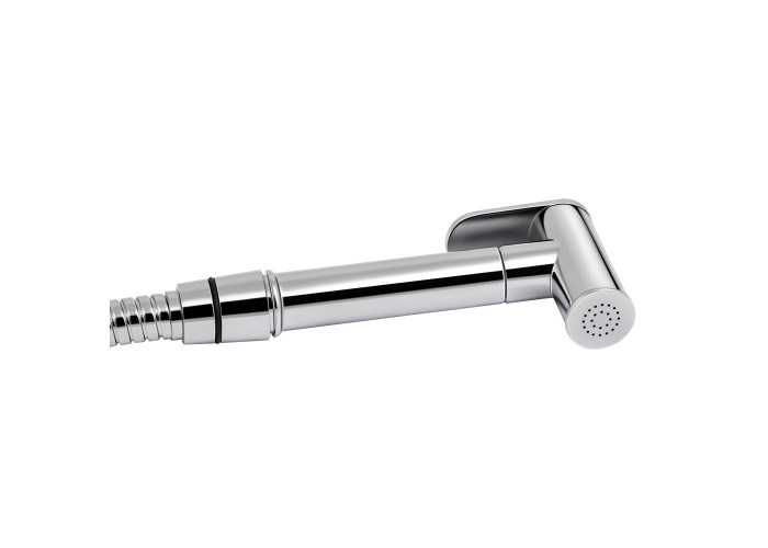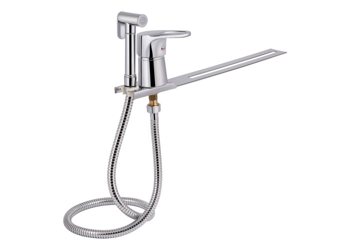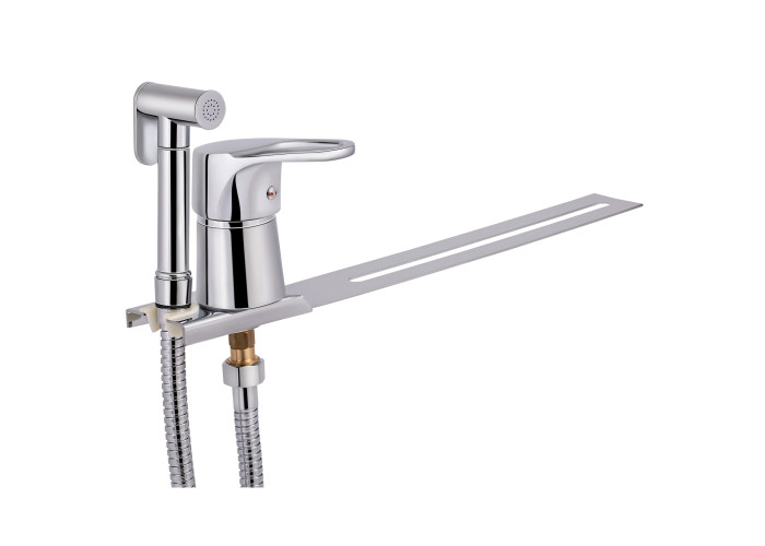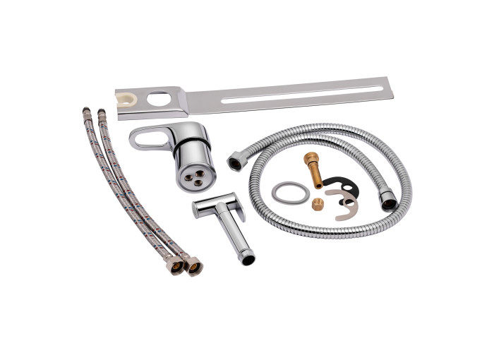 Смеситель, душевой шланг, лейка для гигиенического душа, рейка, крепежи.