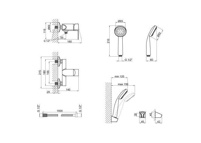 Змішувач, лійка для ручного душу, душовий шланг, кронштейн для ручного душу, кріплення.