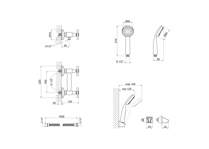 Змішувач, лійка для ручного душу, душовий шланг, кронштейн, кріпильні деталі.