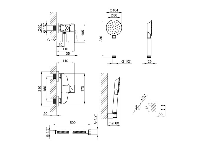 Змішувач, кронштейн для ручного душа, лійка для ручного душа, душової шланг, кріплення.