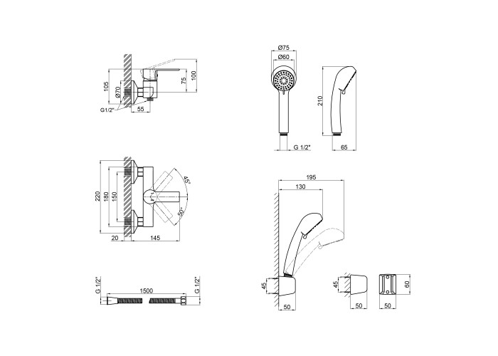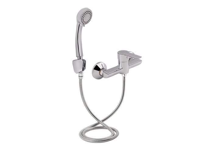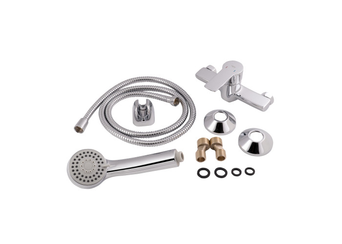 Смеситель, лейка для ручного душа, душевой шланг, кронштейн, крепежи.