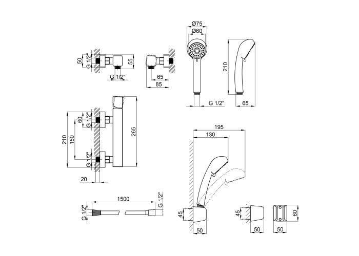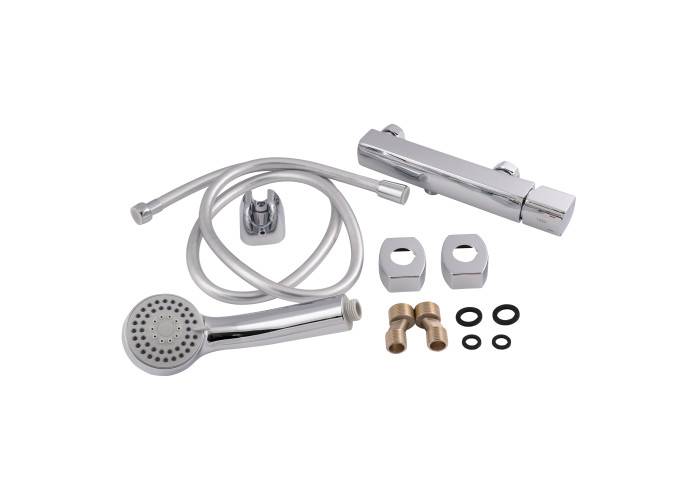 Смеситель, лейка для ручного душа, душевой шланг, кронштейн для ручного душа, крепежи.