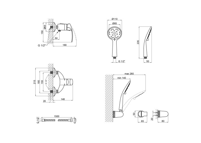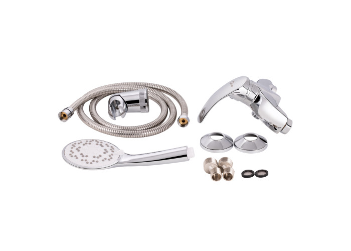Смеситель, лейка для ручного душа, душевой шланг, кронштейн, крепежи.