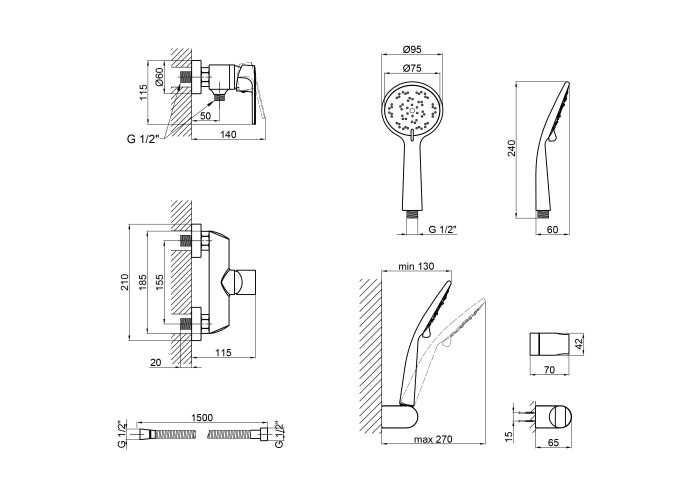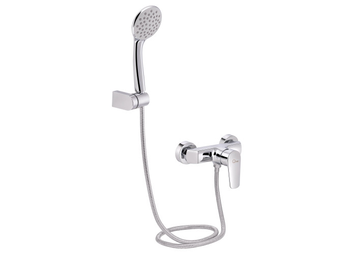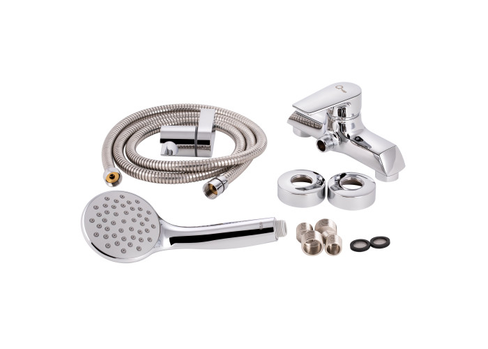 Смеситель, лейка для ручного душа, душевой шланг, кронштейн, крепежи.