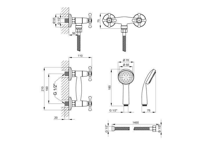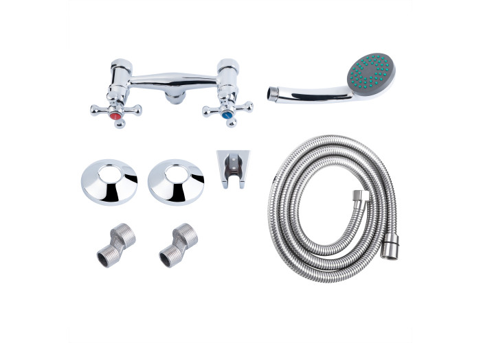 Змішувач, лійка для ручного душу, душовий шланг, кронштейн, кріпильні деталі.