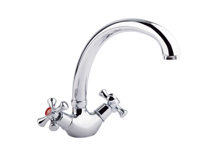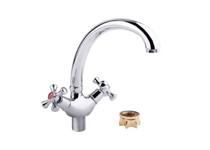 Смеситель для кухни GF (CRM)S-21-273F изготовлен из силумина. Благодаря глянцевому хромированному покрытию имеет оригинальный внешний вид. Выполнен в классическом стиле, с вентильными ручками для переключения потока холодной и горячей воды.