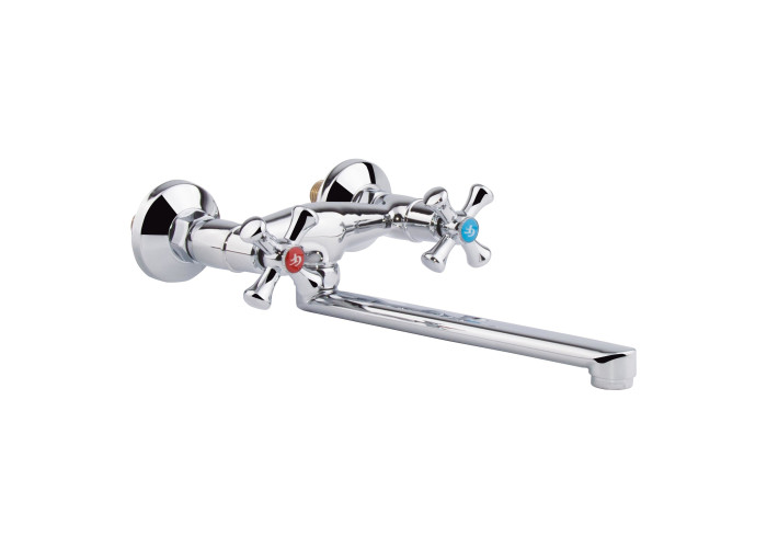 Смеситель для кухни GF (CRM)S-21-361 изготовлен из силумина. Благодаря глянцевому хромированному покрытию имеет оригинальный внешний вид. Выполнен в классическом стиле, с вентильными ручками для переключения потока холодной и горячей воды.