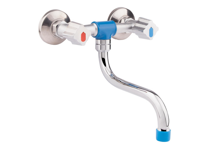 Смеситель для кухни GF (CRM)S-24-361S изготовлен из силумина. Благодаря глянцевому хромированному покрытию имеет оригинальный внешний вид. Выполнен в классическом стиле, с вентильными ручками для переключения потока холодной и горячей воды.