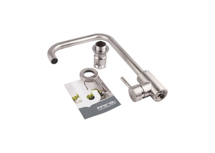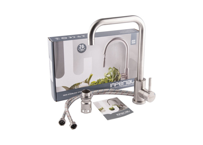 Змішувач для кухні Imperial 31-107-02 виготовлений з нержавіючої сталі. Завдяки нікельованій брашованій поверхні має оригінальний зовнішній вигляд. Виконаний в сучасному стриманому стилі. Такий змішувач не тільки зручний та практичний, а й ідеально доповнить інтер‘єр кухні. Після виточування вироби не проходять додаткове шліфування, незначні подряпини вважаються нормою і не є браком.