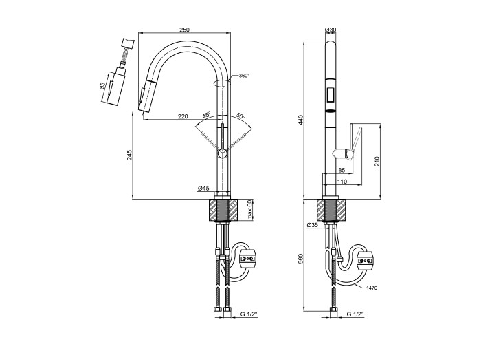 Дополнительные характеристики Длина выдвижного шланга 1470 мм. Длина гибкой подводки 560 мм.