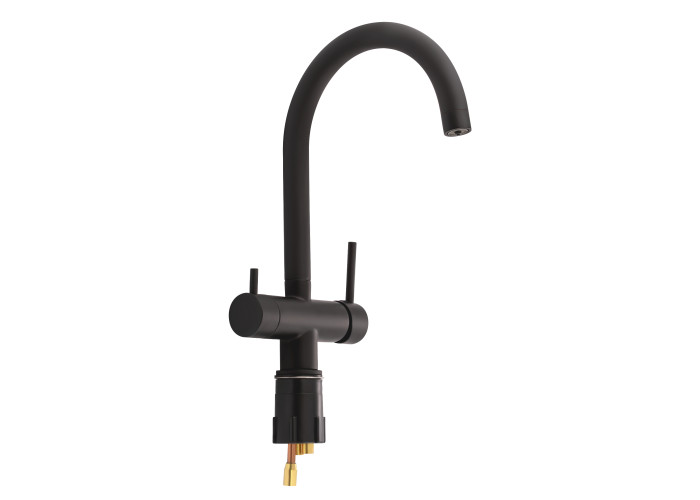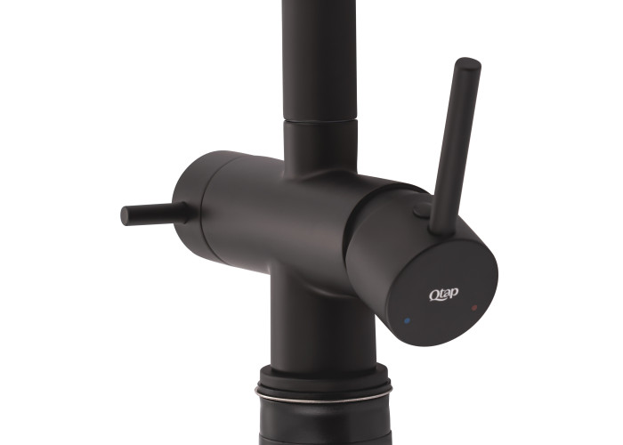 Смеситель для кухни с фильтром Qtap Kuchyne 92102UB изготовлен из высококачественной пищевой латуни, которая не подвержена коррозии, устойчива к ударам и появлению трещин. Матовое черное покрытие повышает долговечность смесителя, придает ему привлекательности. Смеситель имеет однорычажное управление, с помощью которого можно отрегулировать температуру и напор воды. Смеситель может подключаться к фильтру для подачи фильтрованной воды. Изделие выполнено в современном стиле.