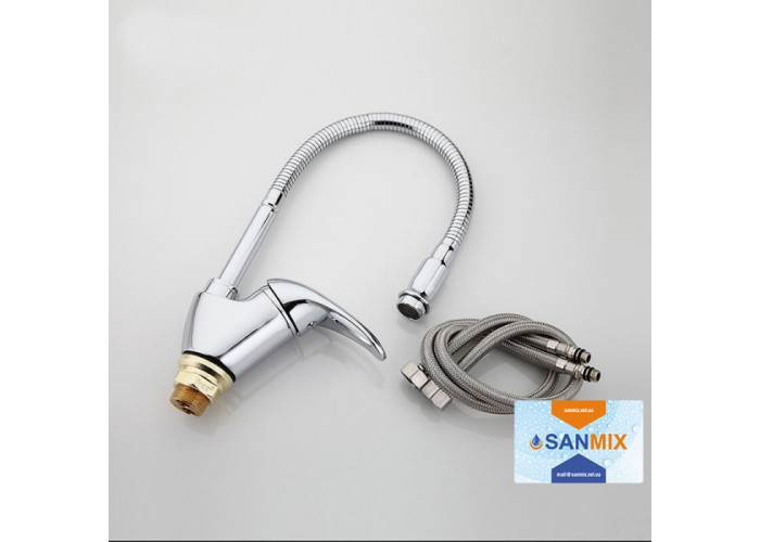 Смеситель для кухни с гибким изливом Frap F4303-1 предназначен для установки на тонкие металлические мойки. Специальное крепление в виде резьбы с гайкой надежно фиксирует изделие на поверхности. В то же время его латунный корпус не боится ржавления. Данный сплав отличается повышенной стойкостью к ржавлению, поэтому может прослужить 5 лет и более. Снаружи все детали конструкции хромированы, что придает им одинаковый вид и упрощает уход.