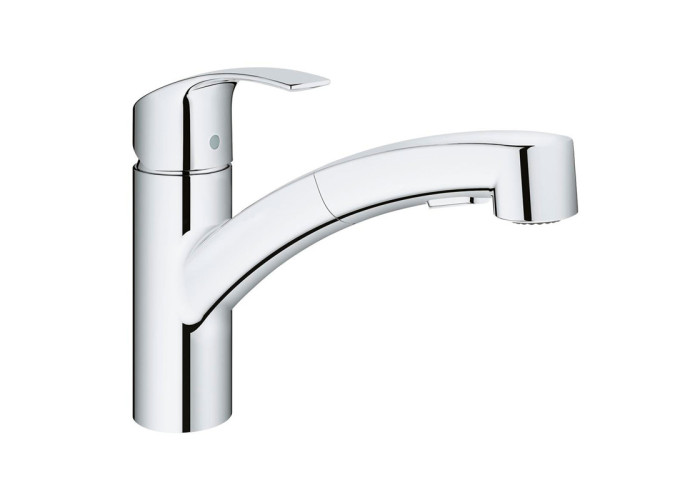 Смеситель выдвижной для кухни Grohe Eurosmart 30305000 со встроенным ограничителем температуры, профессиональная выдвижная двухрежимная лейка - с возможностью переключения с аэратора на душевой струю и наоборот, автоматический переключатель: ламинарный поток/SpeedClean душевой режим струи, автоматическое переключение на ламинарный поток после выключения, регулирования расхода воды, крутящий литой излив, радиус вращения 88 отдельные пути подачи воды - не содержат никель и свинец.